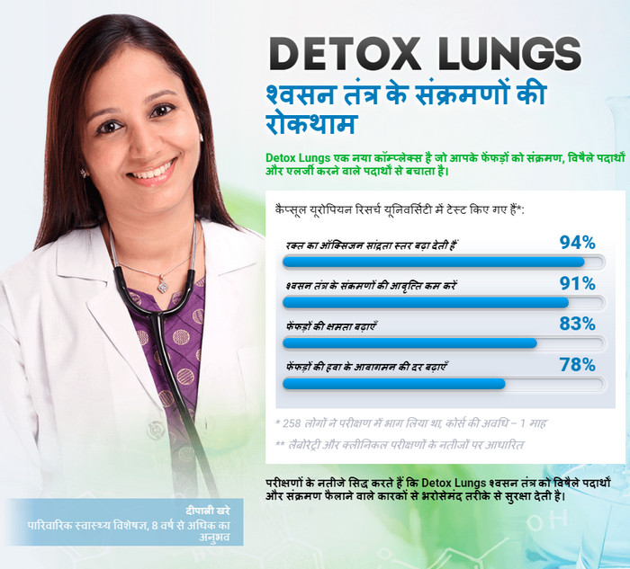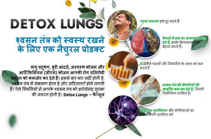 Detox Lungs – एक पौधा परिसर, जिसका मूल सूत्र विशेष रूप से वैज्ञानिकों द्वारा सभी शरीर प्रणालियों की प्राकृतिक सफाई के लिए विकसित किया गया है और इसका उद्देश्य शरीर के सभी पाँच उत्सर्जन प्रणालियों – पाचन, मूत्र, श्वसन, लसीका और त्वचा को सक्रिय करना है।